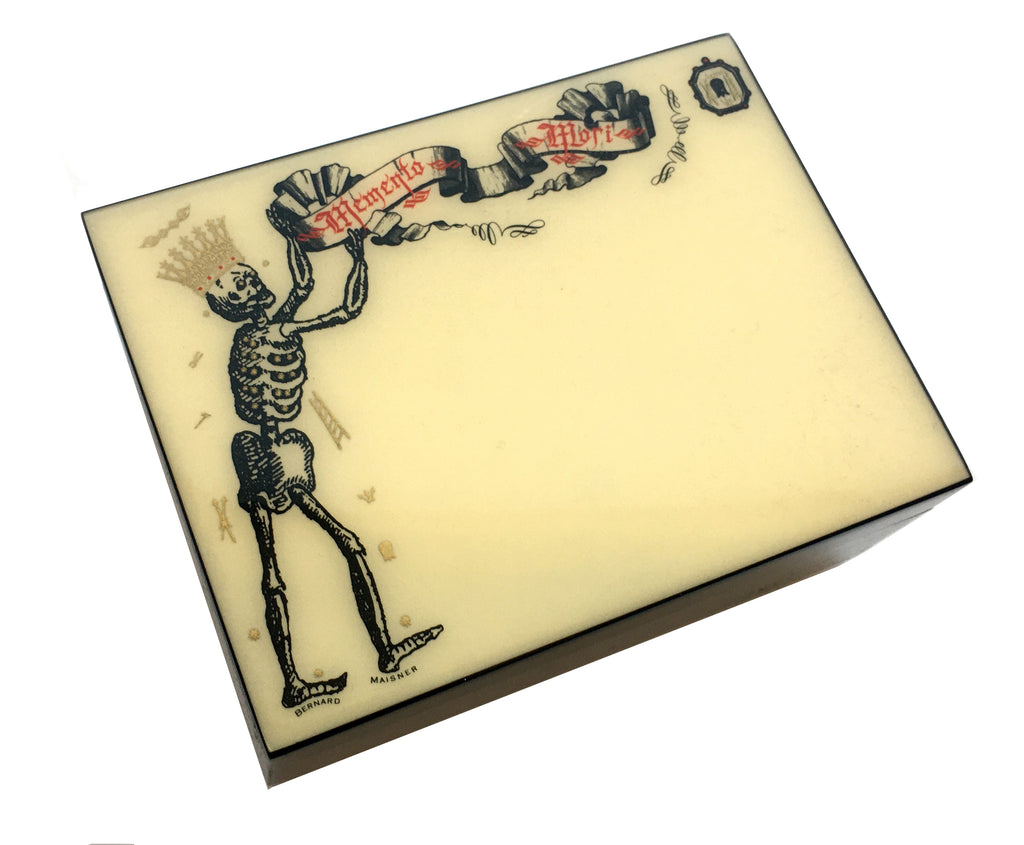 The popular Maisner Memento Mori 3-color engraved image is laminated onto heavy wood. Next it is richly covered in satiny lacquer. You can see the depth of the engraved surface, which captures the light in a very special way, under the heavy application of the luscious lacquer.