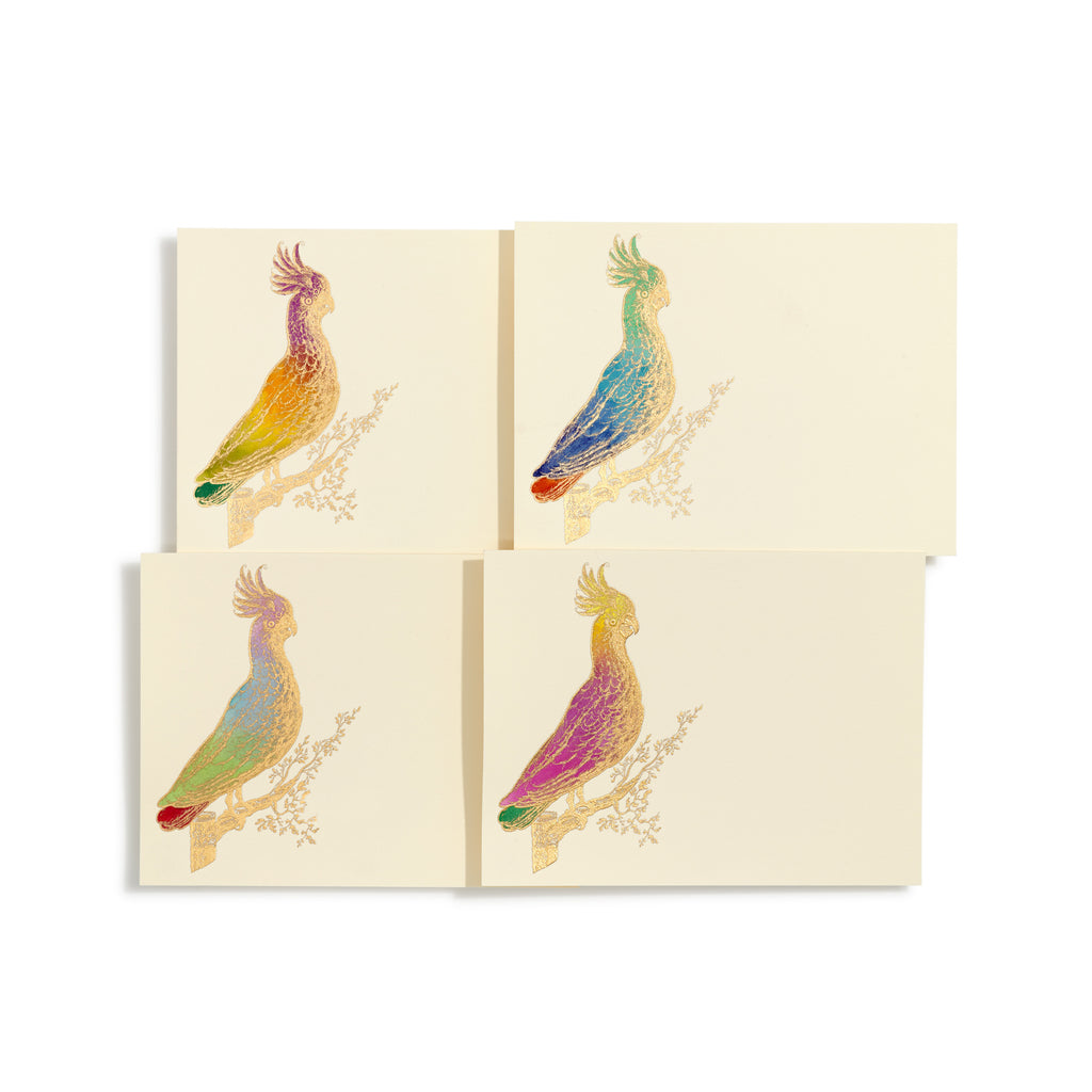 Each gold engraved card features exquisite hand-painted, large cockatoo designs creating eight unique pieces of art. No two are ever alike. The perfect notecard to express your personal messages.