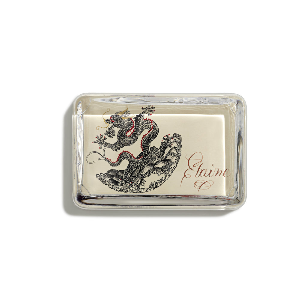 This ferocious 3-color engraved dragon appears in the large rectangle paperweight. Because the glass of each paperweight is handmade, slight variations and champagne bubbles may appear as a natural result of the process. Makes the perfect heartfelt gift.
