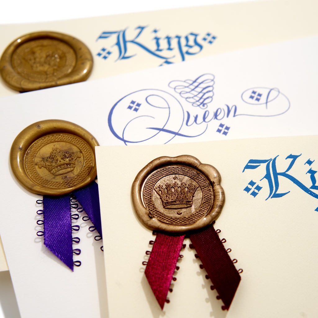 Send a note fit for a king or queen with these regal notecards. Each engraved notecard is individually decorated and stamped with a hot wax seal and satin ribbon. Your recipient is certain to feel like royalty.
