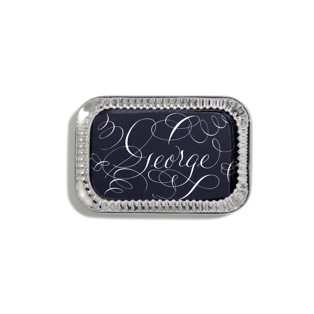 Original one-of-a-kind calligraphy made to order in white ink on a striking dark blue stock. Because the glass of each paperweight is handmade, slight variations and champagne bubbles may appear as a natural result of the process. Makes the perfect heartfelt gift.