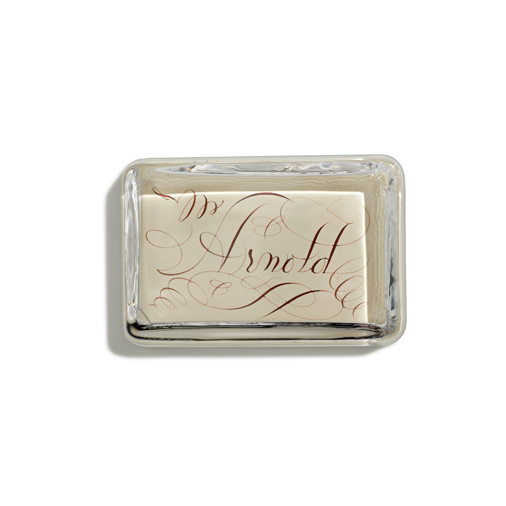 Original one-of-a-kind calligraphy made to order in striking brown ink on cream stock. Because the glass of each paperweight is handmade, slight variations and champagne bubbles may appear as a natural result of the process. Makes the perfect heartfelt gift.