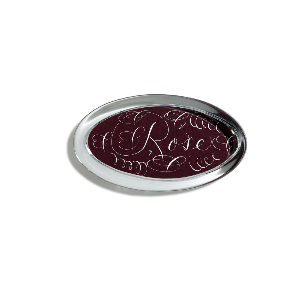 Original one-of-a-kind calligraphy made to order in white ink on a striking maroon stock. Because the glass of each paperweight is handmade, slight variations and champagne bubbles may appear as a natural result of the process. Makes the perfect heartfelt gift.