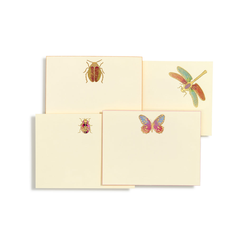 This beautiful notecard set includes two of each butterflies, scarabs, dragonflies and ladybugs. First engraved in luxurious gold, each card is uniquely hand painted, creating eight original pieces of art. The perfect notecards to express your personal message.