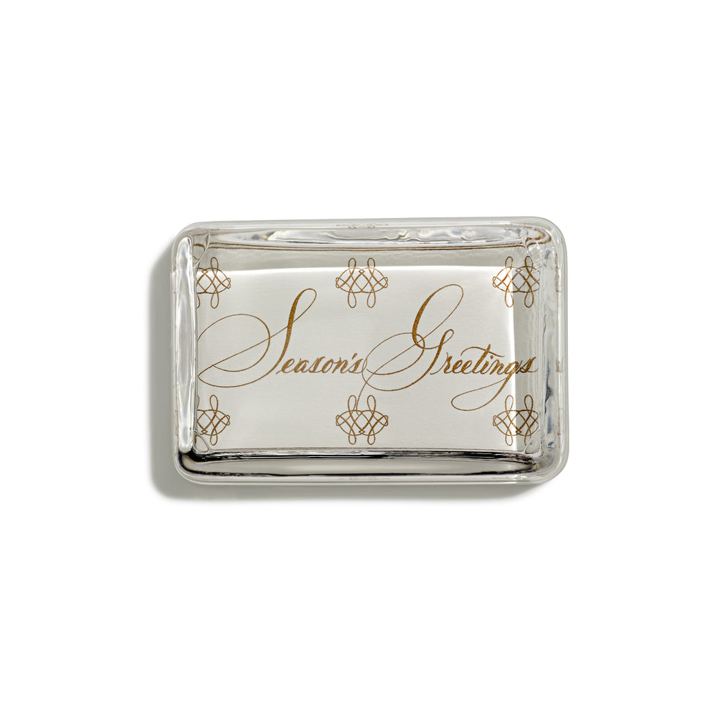 Season's Greetings is engraved in gold on white 100% cotton paper.¾Because the glass of each paperweight is handmade, slight variations and champagne bubbles may appear as a natural result of the process. Makes the perfect holiday gift.