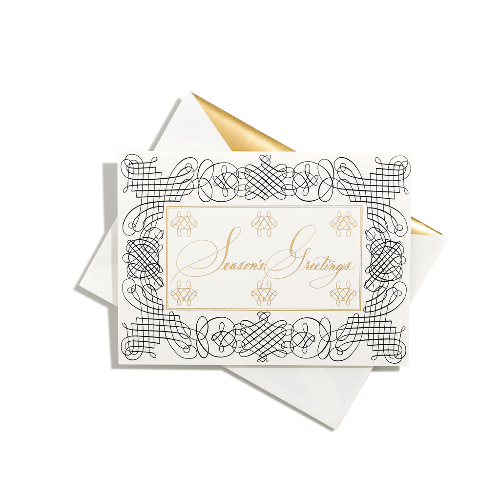 Season's Greetings to you and yours! The lovely gold and black calligraphed card with complimenting gold envelope liner are sure to spread holiday cheer this year.