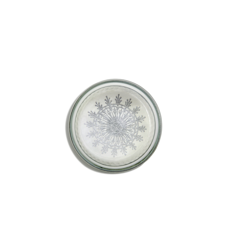 Engraved in silver ink on 100% cotton white stock. This round dome paperweight features decorative dots all around.¾Because the glass of each paperweight is handmade, slight variations and champagne bubbles may appear as a natural result of the process. Makes the perfect heartfelt gift.