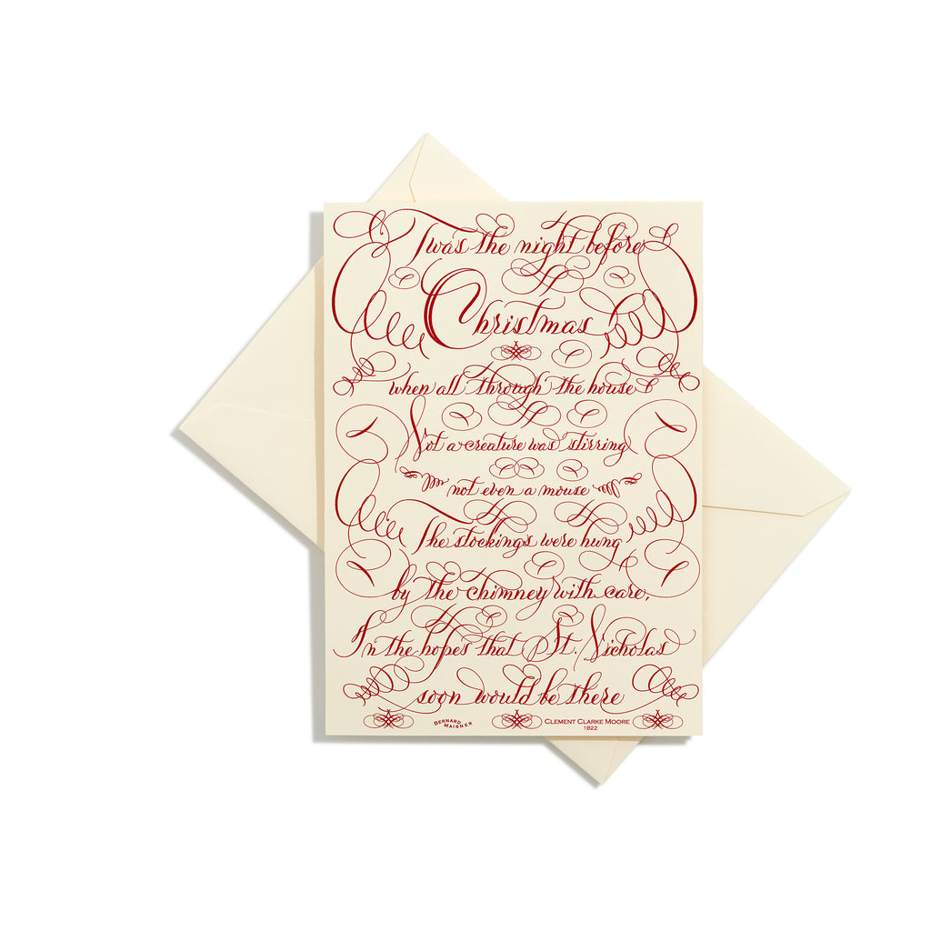 In 1822, Clement Clarke Moore penned the classic "T'was The Night Before Christmas." Today, you can have this beautifully calligraphed card featuring the timeless holiday favorite. A wonderful way to say "Merry Christmas" to those you care about.