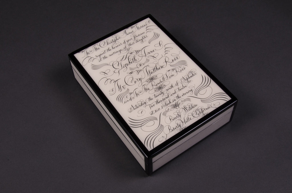 Commemorate those milestone events in your life by capturing your actual invitation in this unique decorative lacquer box. Size, color, and trim is customizable creating a piece that is perfect for wedding and baby shower gifts for anyone including yourself! Each box is a unique work of art. The handcrafted wood box is finished using a centuries old method of layering the lacquer finish to accentuate the rich, hand-painted colors and producing a glowing patina. The luxurious felt lining is ideal for storing everything from paperclips on your desk or you most treasured jewelry on your vanity.