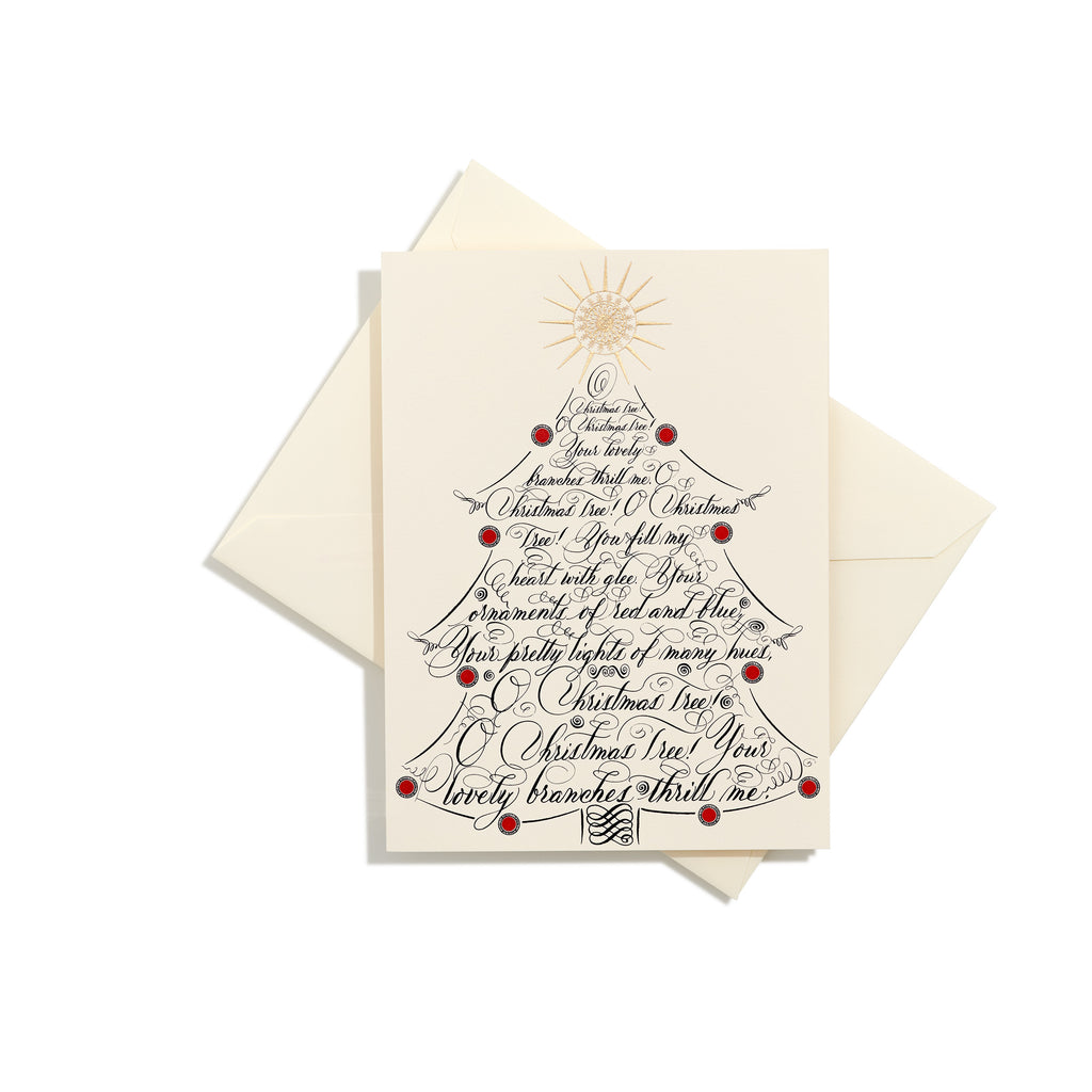 Spread the Christmas cheer with this lovely folder card. The words to the classic carol, "O Christmas Tree" adorn the tree-like decorations accented by pops of vibrant red ornaments. Engraved in gold, black and red. Quite a little jewel of a card!