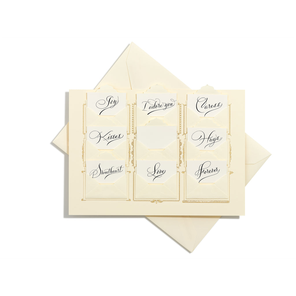 Express your Love in the most unique way. This Grand Statement Secrets Card features nine tiny cards, eight with Bernards beautifully calligraphed words of love (in black ink) and one left blank for you to express your sentiments to your beloved as only you can. The Bernard Maisner Grand Statement cards are unique in the world of fine stationery requiring multiple press runs and heavy thickness stock. Perfect for the special people¾in your life.