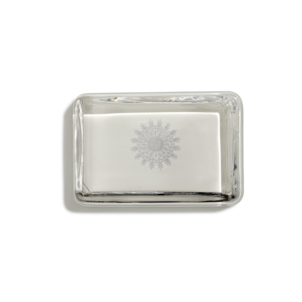 Snowflake is engraved in silver ink on 100% cotton white paper. Because the glass of each paperweight is handmade, slight variations and champagne bubbles may appear as a natural result of the process. Makes the perfect heartfelt gift.