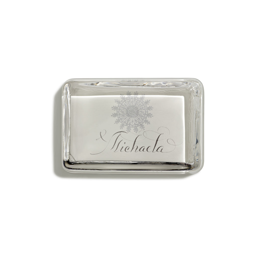 The snowflake is engraved in silver on a striking white stock. Because the glass of each paperweight is handmade, slight variations and champagne bubbles may appear as a natural result of the process. Makes the perfect heartfelt gift.