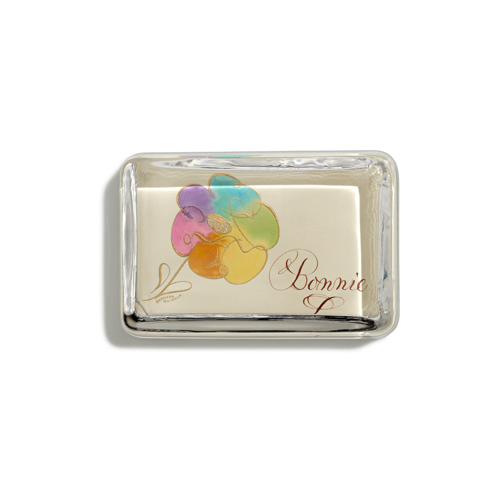 First engraved in gold, each flower is then uniquely hand painted on cream stock. Because the glass of each paperweight is handmade, slight variations and champagne bubbles may appear as a natural result of the process. Makes the perfect heartfelt gift.