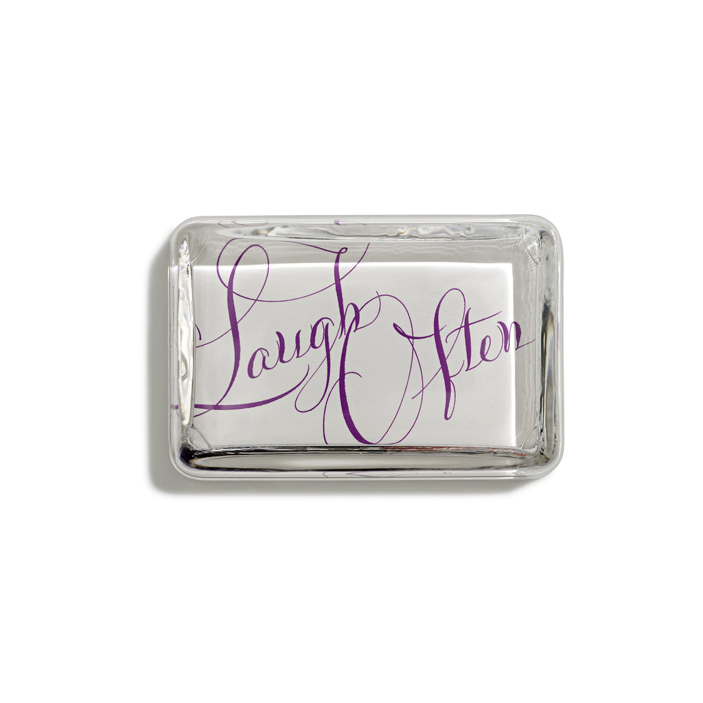Great advice is engraved in deep purple on white stock. Because the glass of each paperweight is handmade, slight variations and champagne bubbles may appear as a natural result of the process. Makes the perfect heartfelt gift.