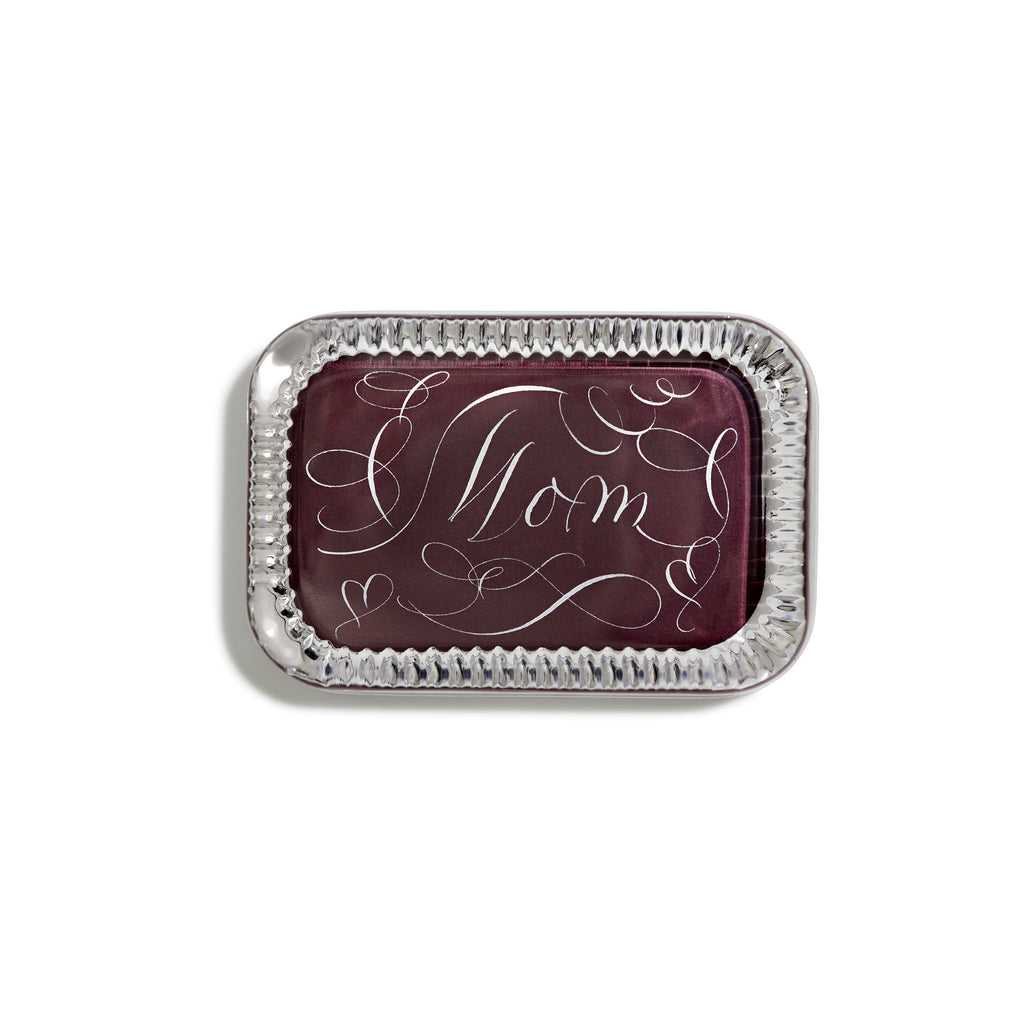 Original one-of-a-kind calligraphy made to order in white ink on a striking maroon stock. Because the glass of each paperweight is handmade, slight variations and champagne bubbles may appear as a natural result of the process. Makes the perfect heartfelt gift.