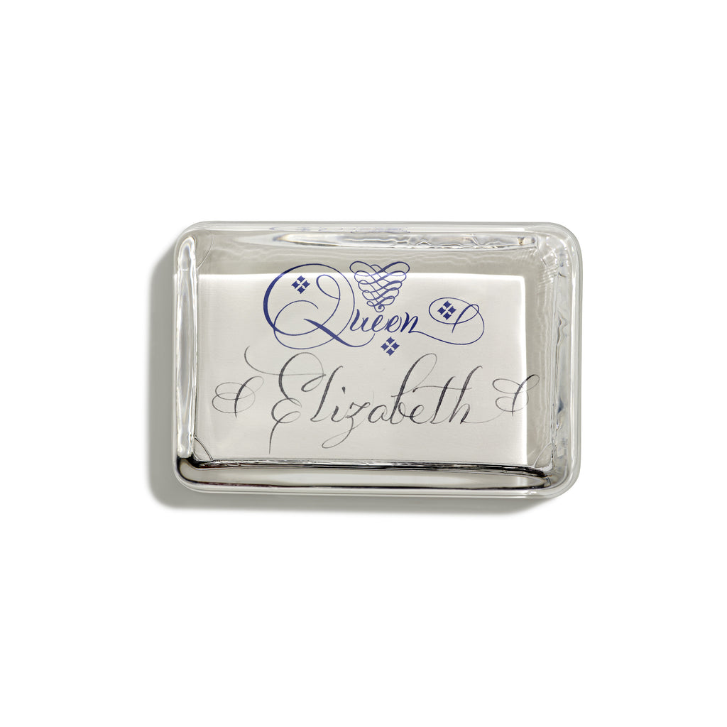 "Queen" is engraved in purple ink on 100% cotton white stock.Because the glass of each paperweight is handmade, slight variations and champagne bubbles may appear as a natural result of the process. Makes the perfect heartfelt gift.
