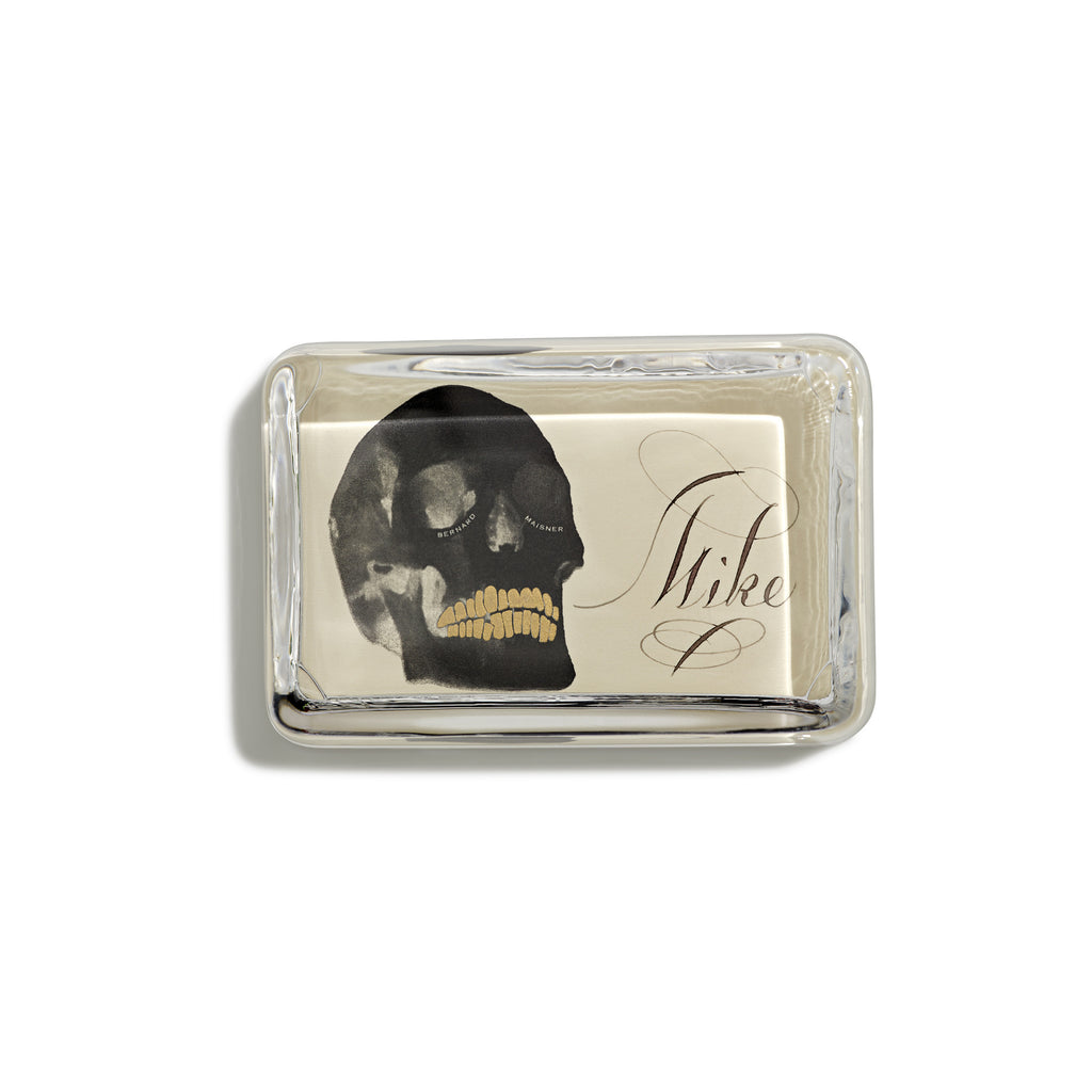 This skull is engraved in black and gold on cream stock. Because the glass of each paperweight is handmade, slight variations and champagne bubbles may appear as a natural result of the process. Makes a unique gift.
