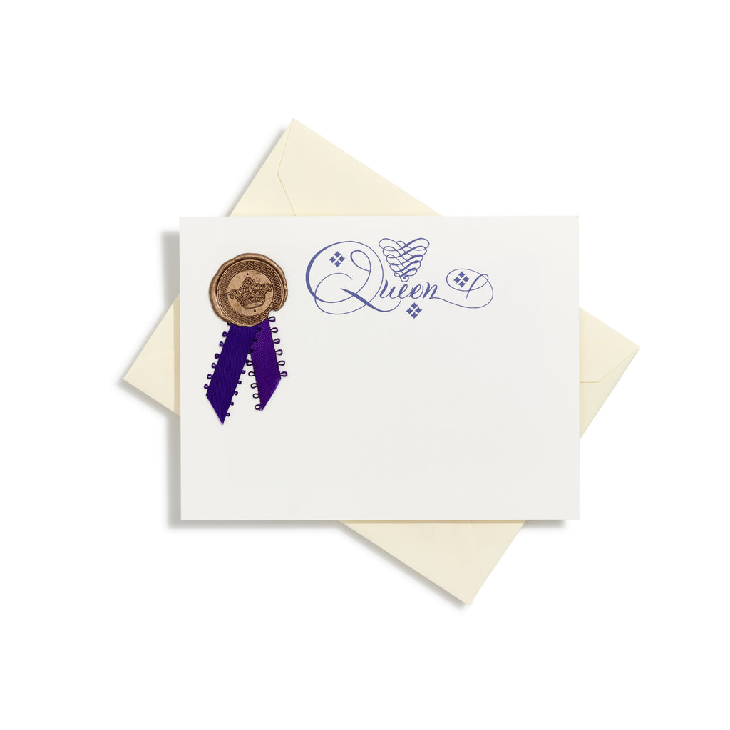 Treat yourself like a queen with these regal notecards. Each engraved notecard is individually decorated and stamped with a hot wax seal and satin ribbon. Your recipient is certain to feel like royalty.