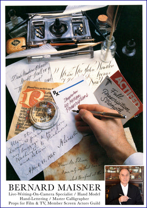His feature films include The Age of Innocence, stepping in as Daniel Day Lewis’s hand; Sleepy Hollow, as Johnny Depp’s character; and Finding Forrester, as Sean Connery’s character. Mr. Maisner worked on set creating period letters and envelopes as props for Sherlock Holmes, and he created letters and envelopes as props for P.S. I Love You, as Gerard Butler’s character.