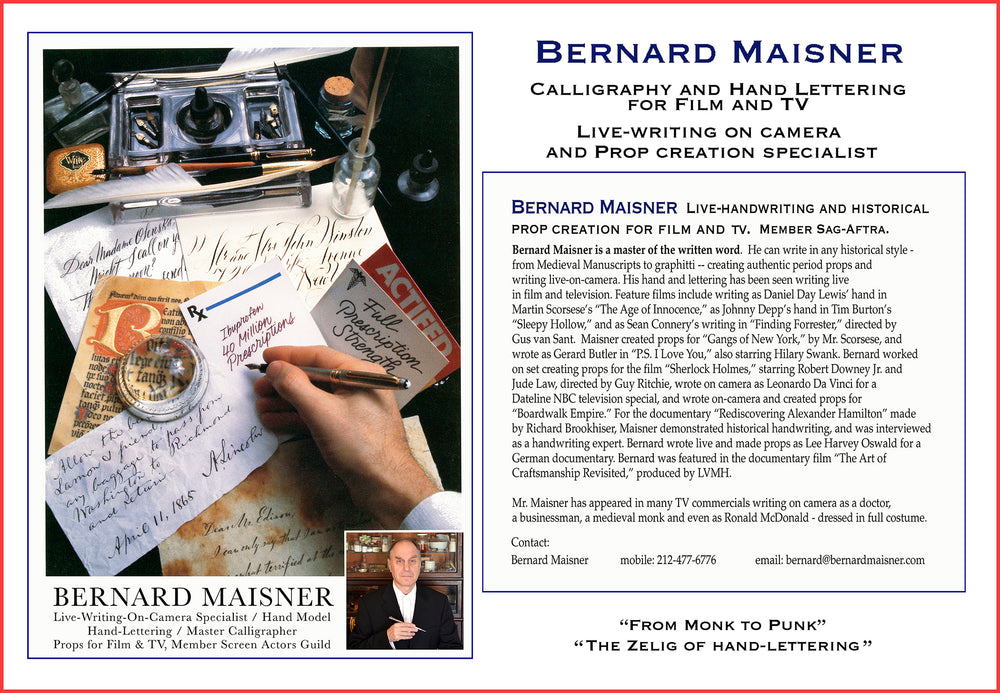 Mr. Maisner is a master of the handwritten word and is well known for his ability to write and letter in any historical style—from Medieval manuscripts to modern-day graffiti. He also creates authentic period props and is experienced writing live on-camera. He is cool, calm and collected in front of the camera, making shoots efficient and quickly completed. He is adept at extreme close up (ECU) filming as well.